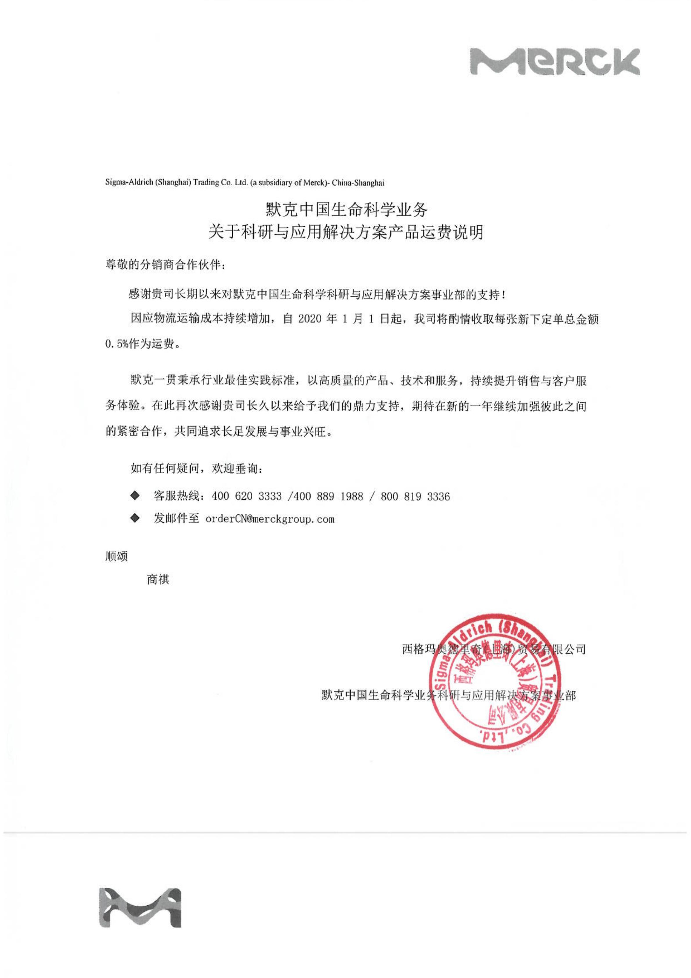 Sigma-Aldrich品牌|2020年度默克-西格玛产品运费说明