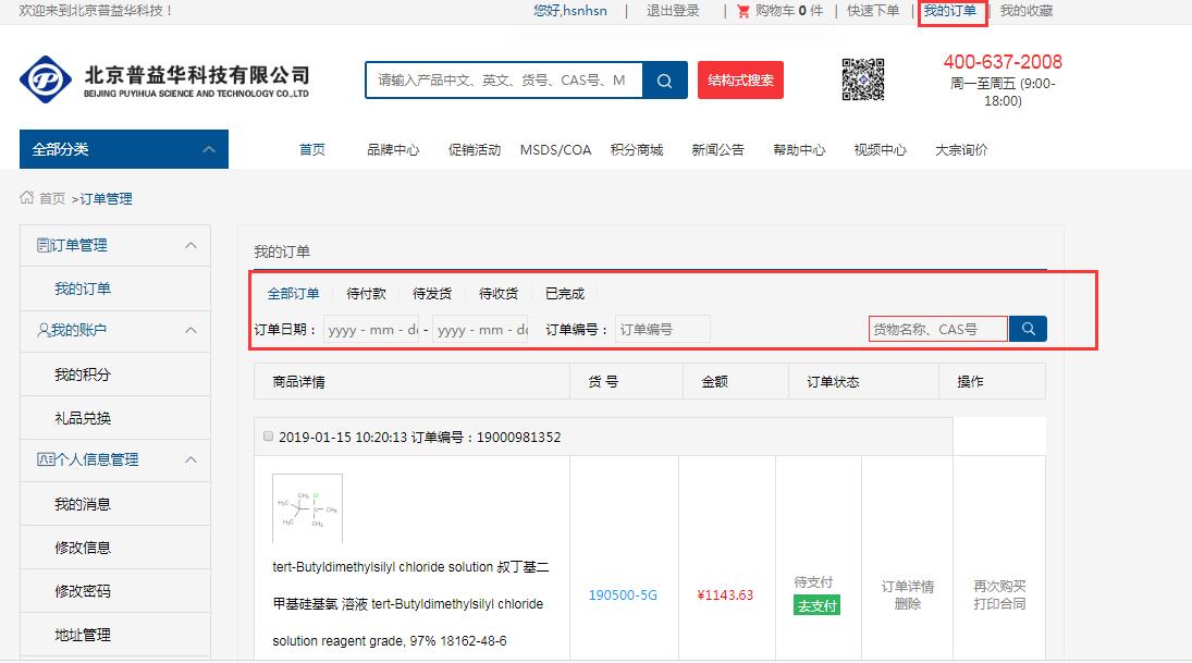 可以通过订单状态、下单时间、产品cas号来筛选订单查询(有任何疑问可联系我司客服:400-637-2008)
